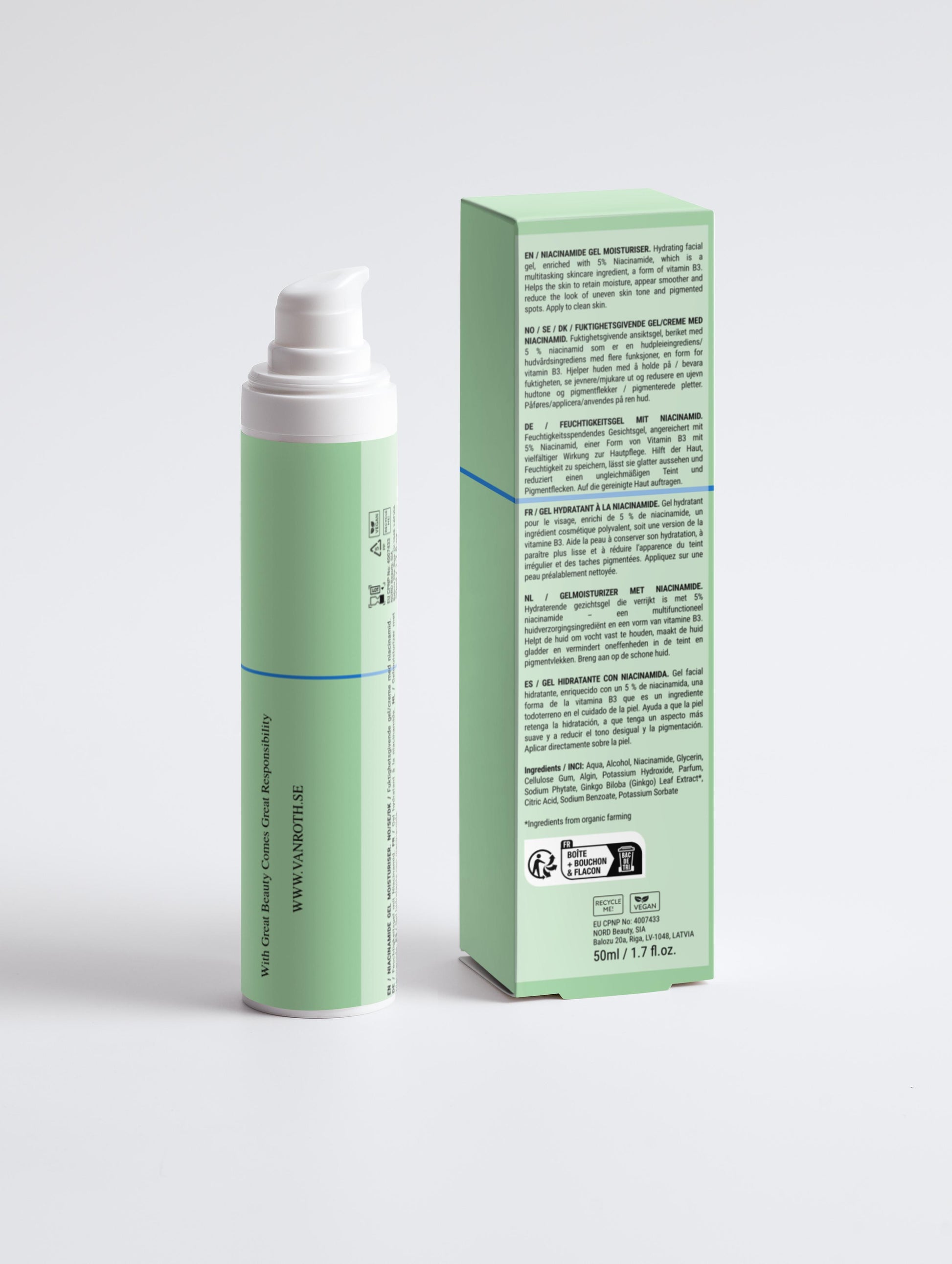 Ingredienser / INCI: Aqua/Vatten, Alkohol, Niacinamid, Glycerin, Cellulosagummi, Algin, Kaliumhydroxid, Parfym, Natriumfytat, Ginkgo Biloba (Ginkgo) Bladextrakt*, Citronsyra, Natriumbenzoat, Kaliumsorbat