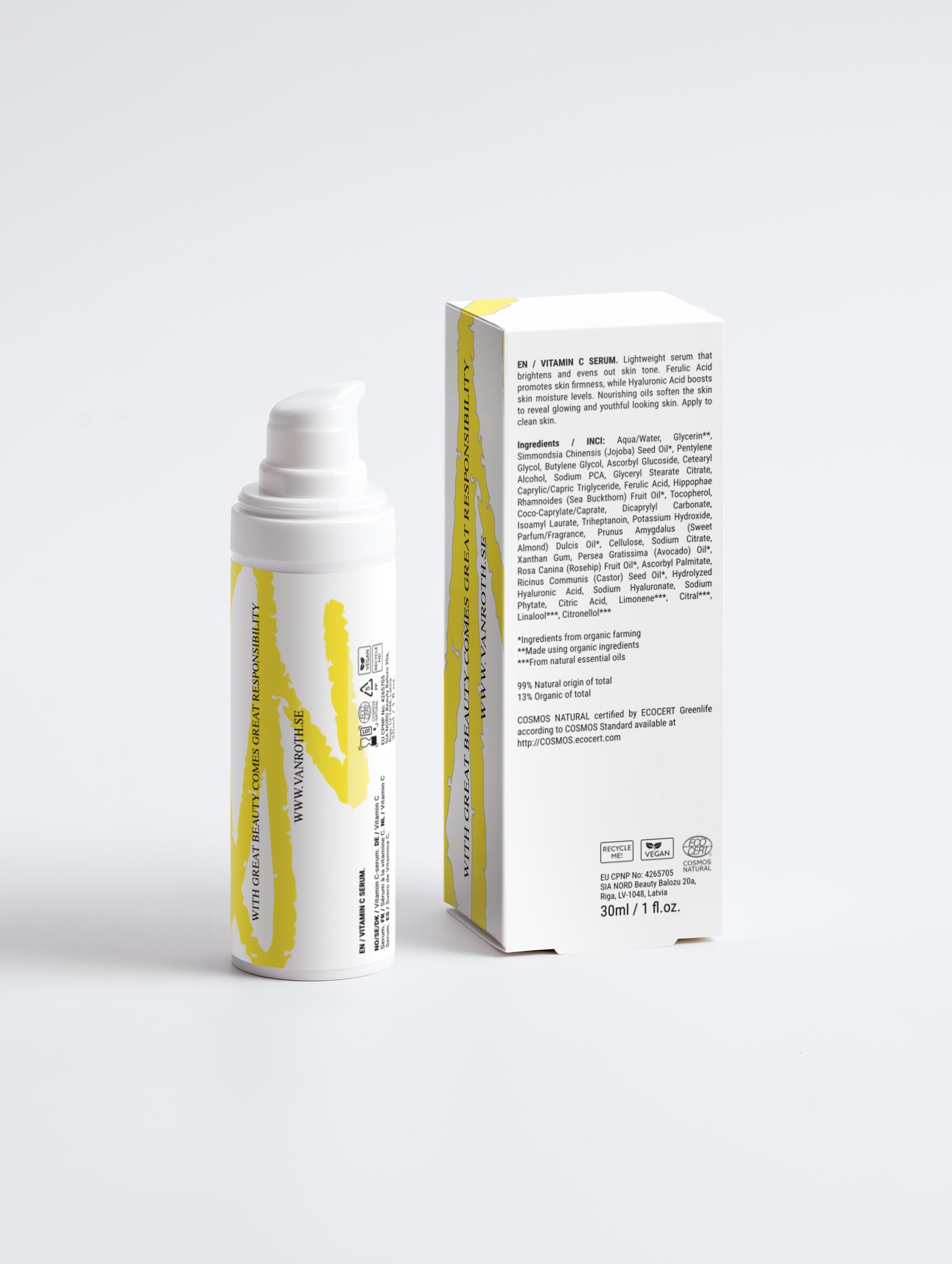 Vitamin C (2%), Ferulinsyra, Havtornsolja, Vitamin E, Hyaluronsyra, Jojoba, Mandel-, Avokado- & Nyponolja, Sodium PCA