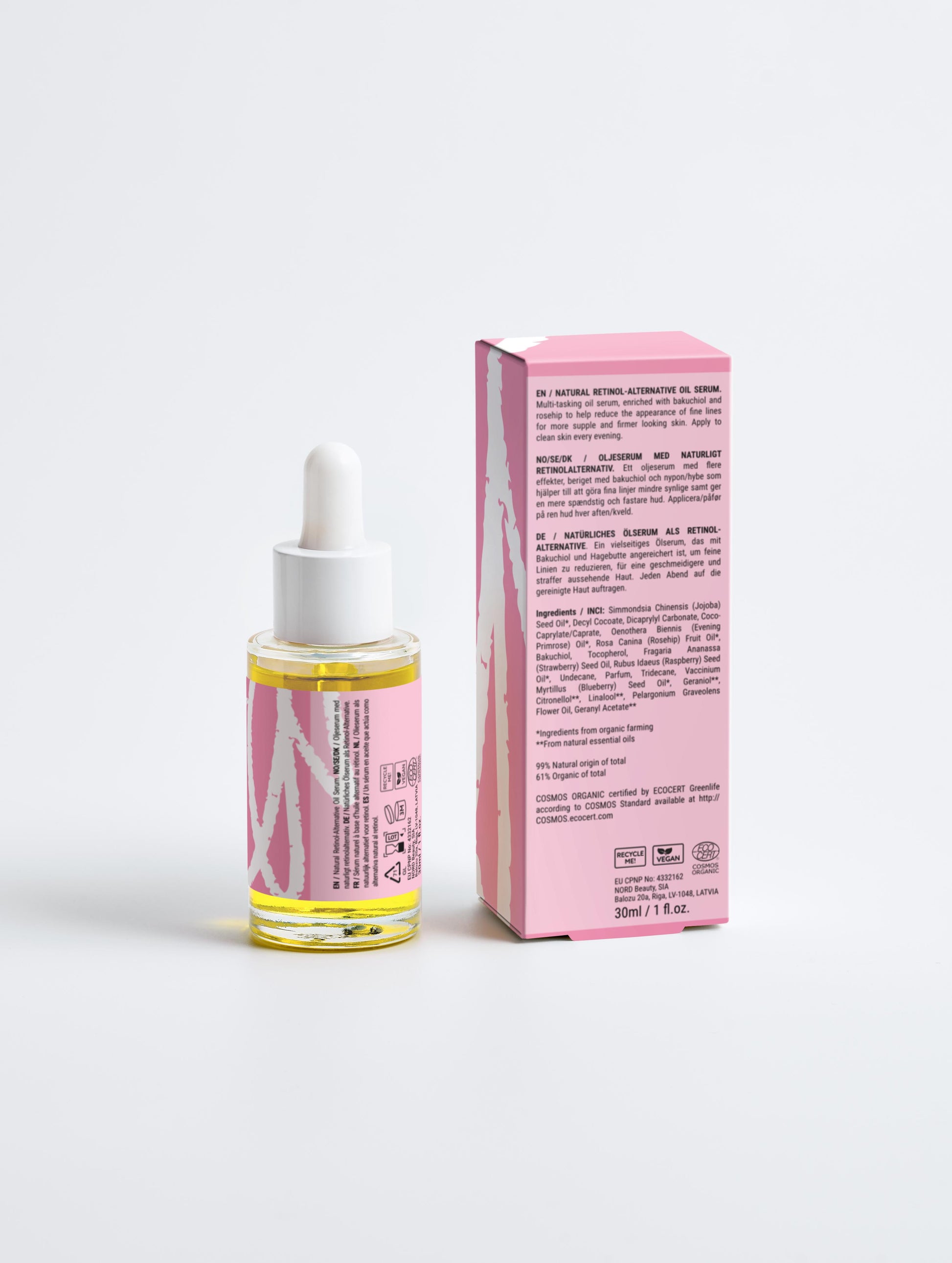 Bakuchiol, Nyponolja, Jojobaolja, Jordgubbsfröolja, Hallonolja, Blåbärsfröolja, Kvällsolrosolja